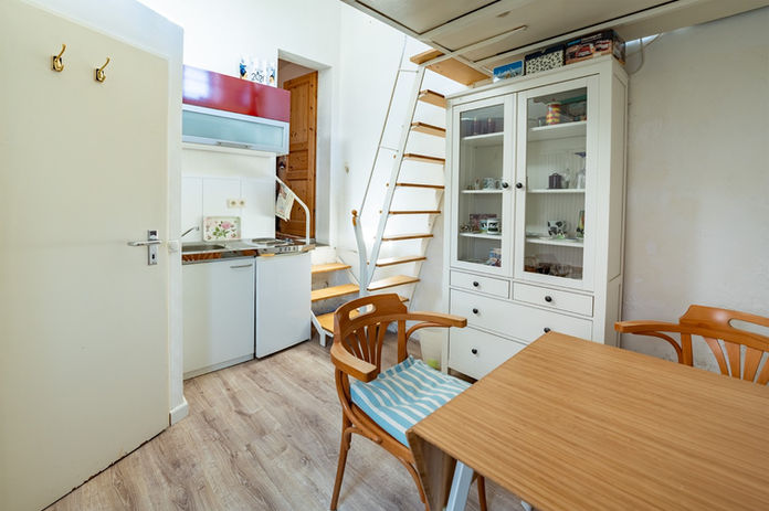 Im Erdgeschoss befinden sich eine gemütliche Wohnküche, ein Flur mit Gäste-WC und ein Arbeitszimmer. Von hier besteht Zugang in einen Anbau mit einer Küchenzeile und einer Schlafempore. Der Anbau verfügt über einen eigenen Eingang vom Hof und könnte dadurch auch autark genutzt werden.