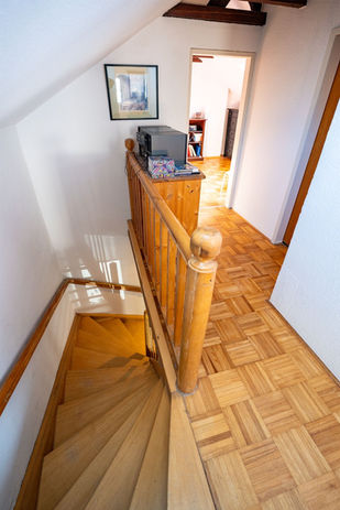 Im Obergeschoss des Hauptgebäudes befinden sich zwei Schlafzimmer sowie ein weiteres Badezimmer. Vom Flur im Erdgeschoss besteht ferner Zugang zu einem Gewölbekeller, in dem die Haustechnik untergebracht ist.